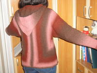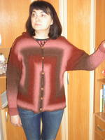 Кауни 8/2, цвет Brown - pink, расход 398 гр., спицы 3,0. Вязала свободно и поэтому получилось рыхло и кофта после "водных процедур" подрастянулась и стала великовата, при сушке положила не очень удачно, низ слегка растянулся, это даже на фото видно |