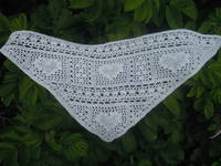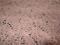 Шаль примечательна тем, что форма ее трапецивидная, кайма ввязывается в шаль. Размеры: высота по центру 115 см., ширина по верху 170 см., ширина по низу 50см. Нитки Пехорка Элитная 50гр.=415м, ушло 2,5 мотка, спицы №2,75мм., бисер №8, ушло 30гр. Больше фотографий можно посмотреть здесь