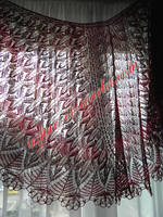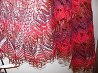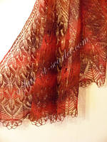 Кауни 8/1, цвет red, около 106 грамм, спицы №3,5. Размер шали: размах около 160 см, высота 75 см, низ около 380 см (!) - и это потому низ круглый Элементики узнаёте?