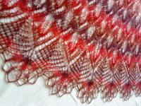 Вязала из Кауни Red 8/1,ушло около 140г,не хватило пасмы на 2 последних рада шали,подобрала нитки по цвету из пасмы цвета Ржавчина Размах крыльев по верхней части 200 см , по нижней части 395 см Высота по центру 94см Вообще,получила удовольствие при вязании.Спасибо Вам, очень интересно было вязать и мозги напрягать. Довяжу свои "долгострои" и еще что-нибудь интересаное у Вас прикуплю |