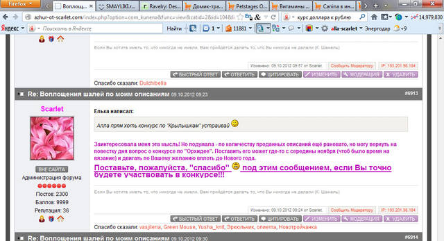 Я уже писала, что с удовольствием приму участие в конкурсе. Мне тоже хотелось бы чтоб конкурс состоялся.